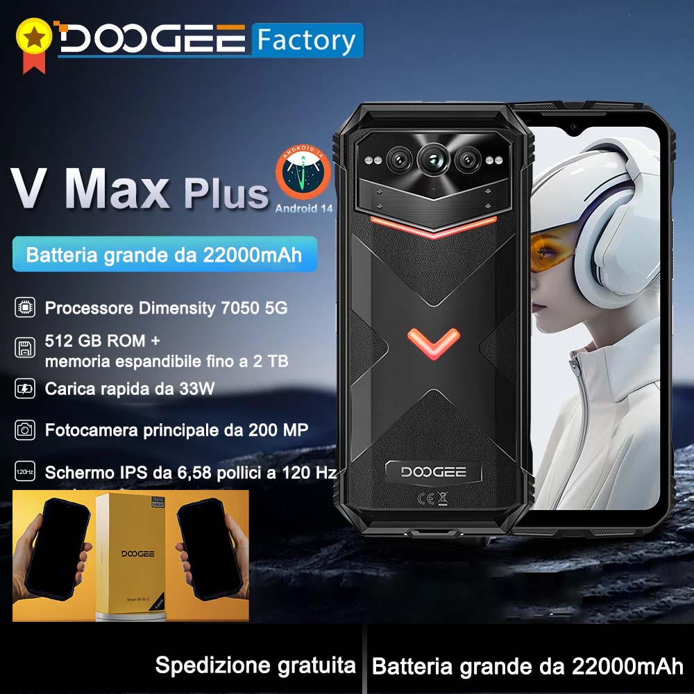 Doogee V Max Plus è uno smartphone estremamente resistente che non teme danni. Presenta una struttura robusta, componenti rinforzati e la certificazione MIL-STD-810H, superando i test di caduta su diverse superfici, angoli e bordi. Con certificazione IP68 e IP69K, è resistente ad acqua, umidità, polvere e sabbia.